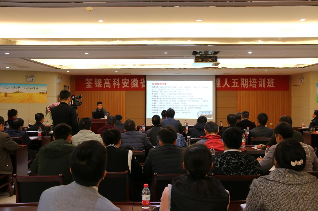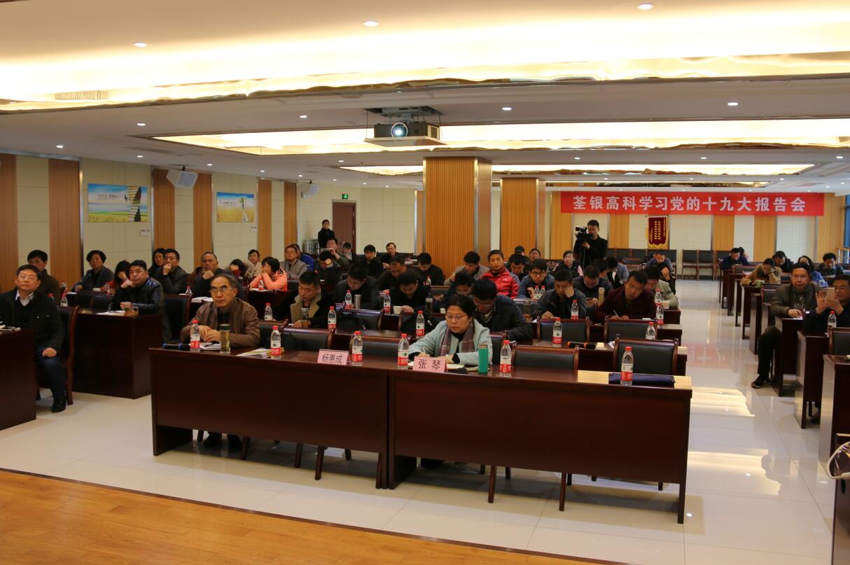20171130日上午,為深入學習宣傳中國共產黨第十九次全國代表大會精神,荃銀高科邀請黨的十九大代表、安徽農業大學茶與食品科技學院院長張正竹教授來公司作黨的十九大精神宣講。宣講報告會在荃銀高科六樓多功能廳舉行,公司經營班子成員、全體黨員、安徽省首屆農業職業經理人學員以及公司部分員工參加了學習。會議由公司黨支部書記廖孝波主持。