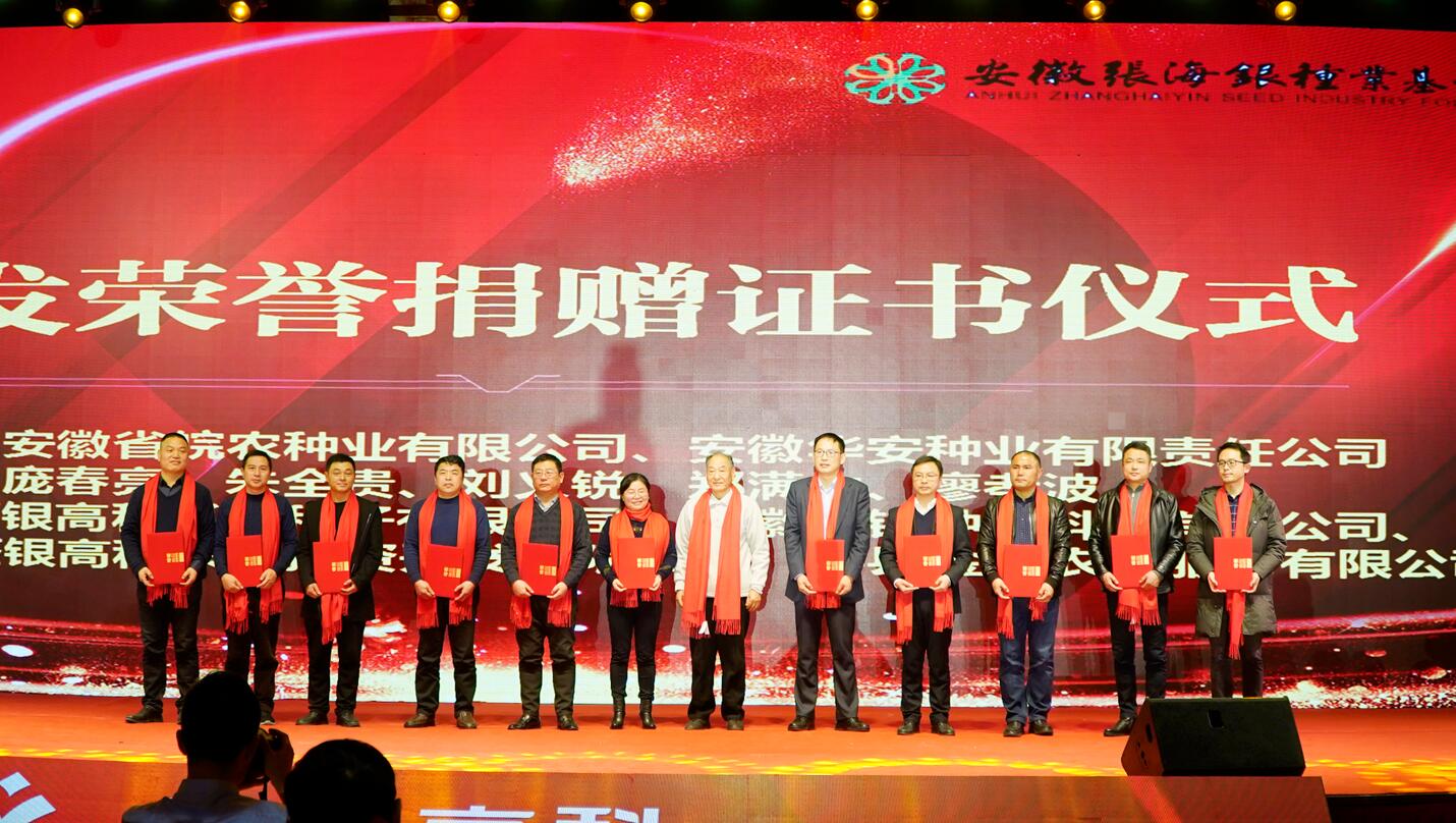 ?? “踐行公益,奉獻(xiàn)愛心”。會(huì)上,進(jìn)行了安徽張海銀種業(yè)基金會(huì)頒發(fā)捐贈(zèng)證書儀式,眾人拾柴火焰高,希望更多的人關(guān)注慈善公益事業(yè),為公益多盡一份力。