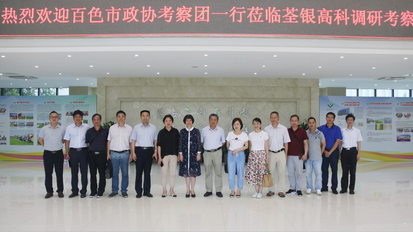 ??? 2019年7月8日下午,廣西壯族自治區(qū)百色市政協(xié)副主席蔡文姬率考察團(tuán)一行蒞臨荃銀高科調(diào)研考察。合肥市政協(xié)人資環(huán)委主任張立、市農(nóng)業(yè)農(nóng)村局副局長李軍、高新區(qū)農(nóng)村工作局副局長江水等領(lǐng)導(dǎo)陪同調(diào)研。荃銀高科副董事長兼總經(jīng)理張琴、副總經(jīng)理兼首席技術(shù)官張從合、財(cái)務(wù)總監(jiān)張慶一等領(lǐng)導(dǎo)熱情接待了考察團(tuán)一行。